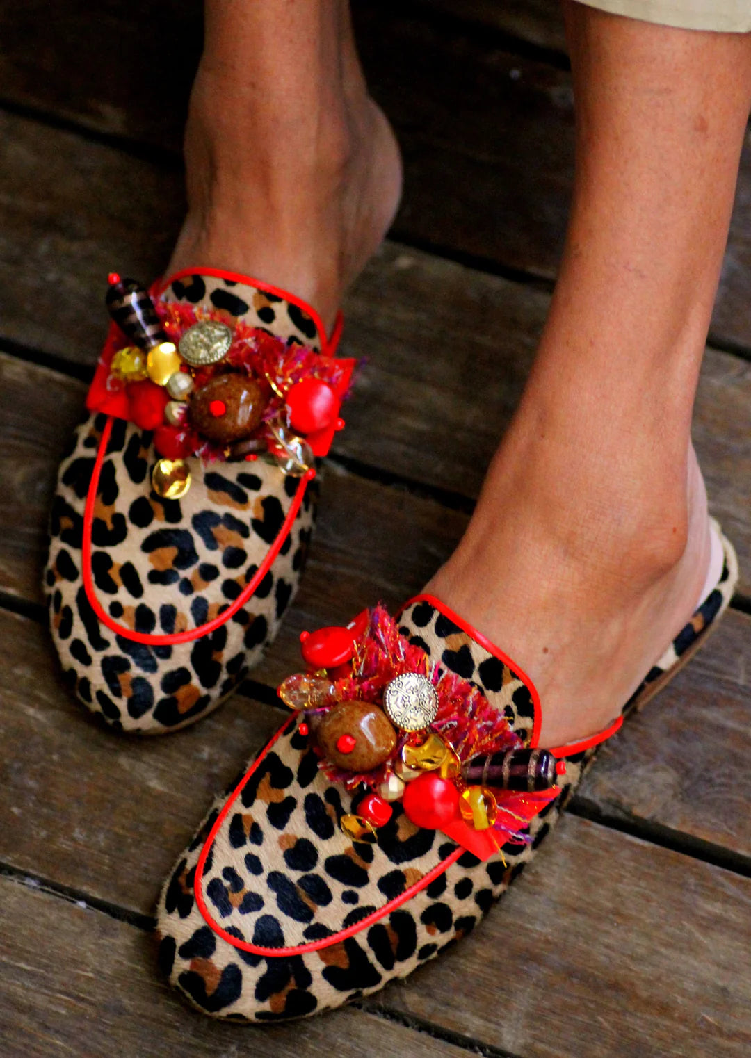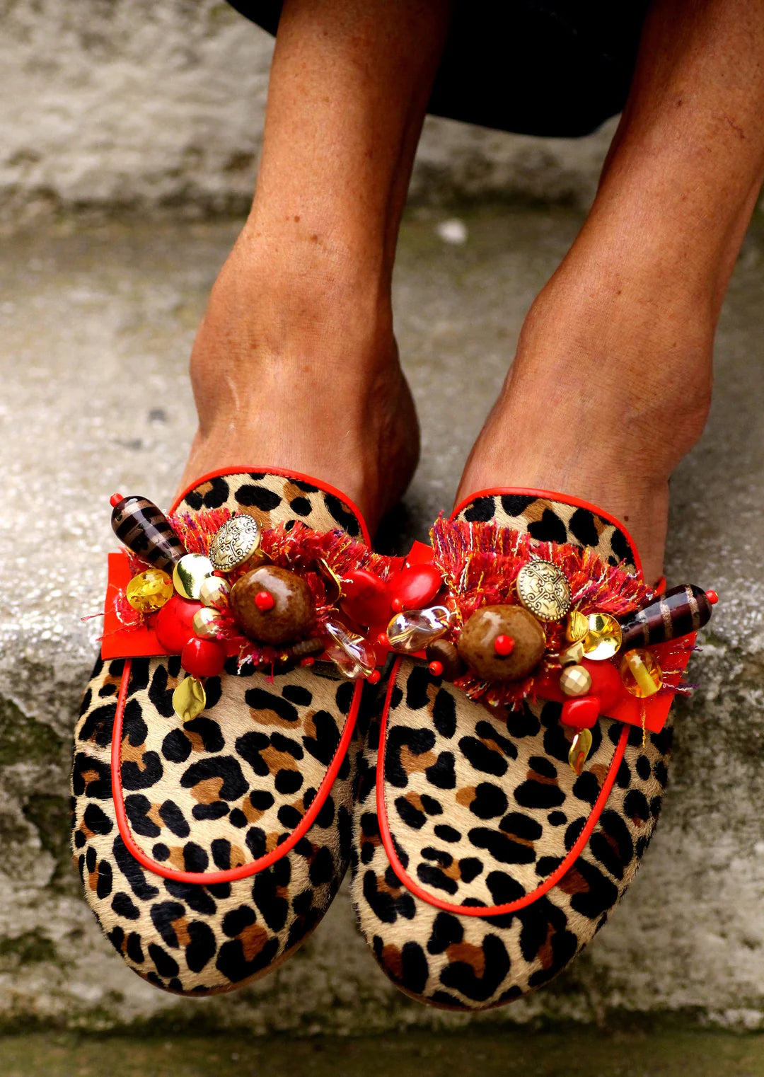 C’est une chaussure ouverte à l’arrière, de type mule, avec un motif léopard sur toute la surface. Son liseré rouge vif souligne les contours et apporte un contraste saisissant avec l’imprimé animal.