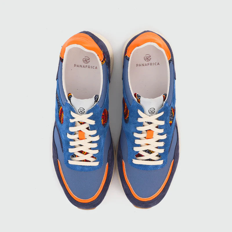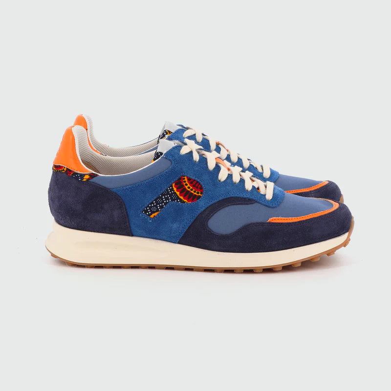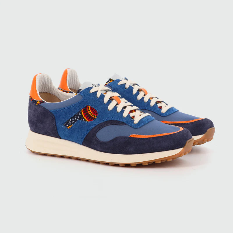 Couleurs principales : La chaussure mélange différentes nuances de bleu (marine et bleu clair), rehaussées par des détails orange vif et des motifs colorés d’inspiration ethni