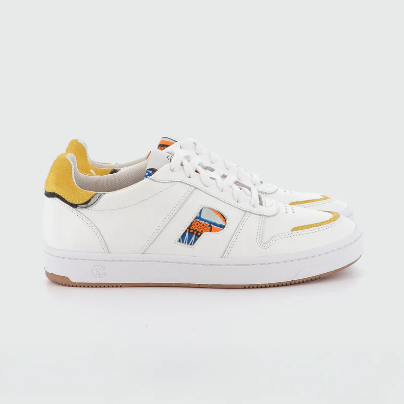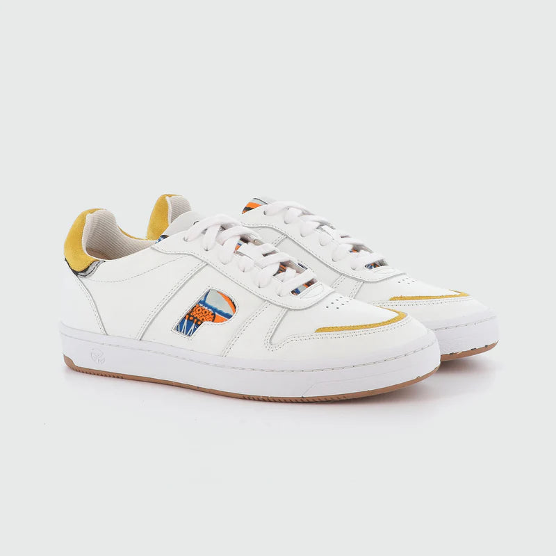 Cette paire de sneakers présente une base en cuir blanc lisse, au style sobre et épuré. La semelle est blanche avec une finition gomme couleur naturelle, ce qui apporte un contraste subtil et une touche sportive. Le modèle est bas, avec une coupe classique rappelant les baskets rétro.