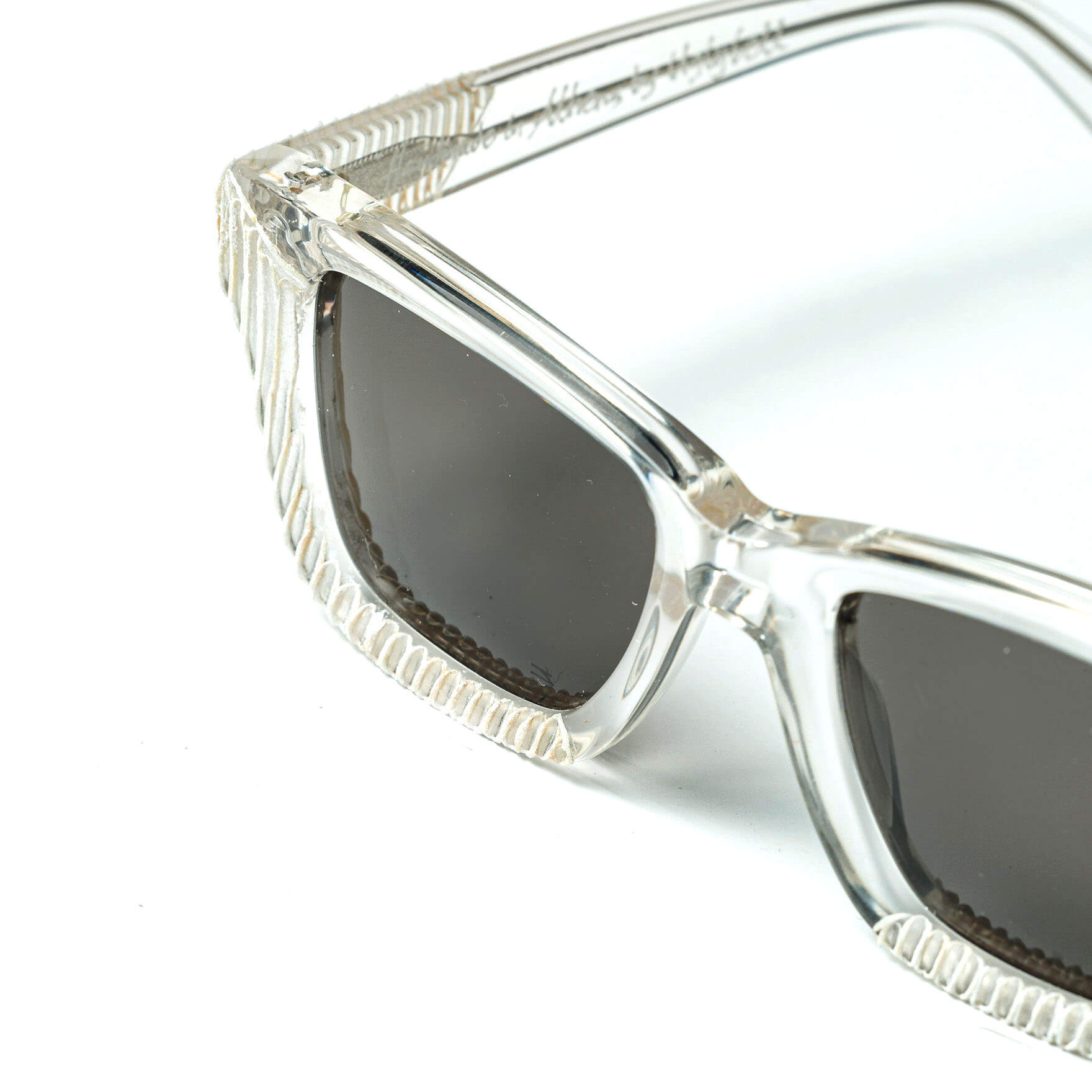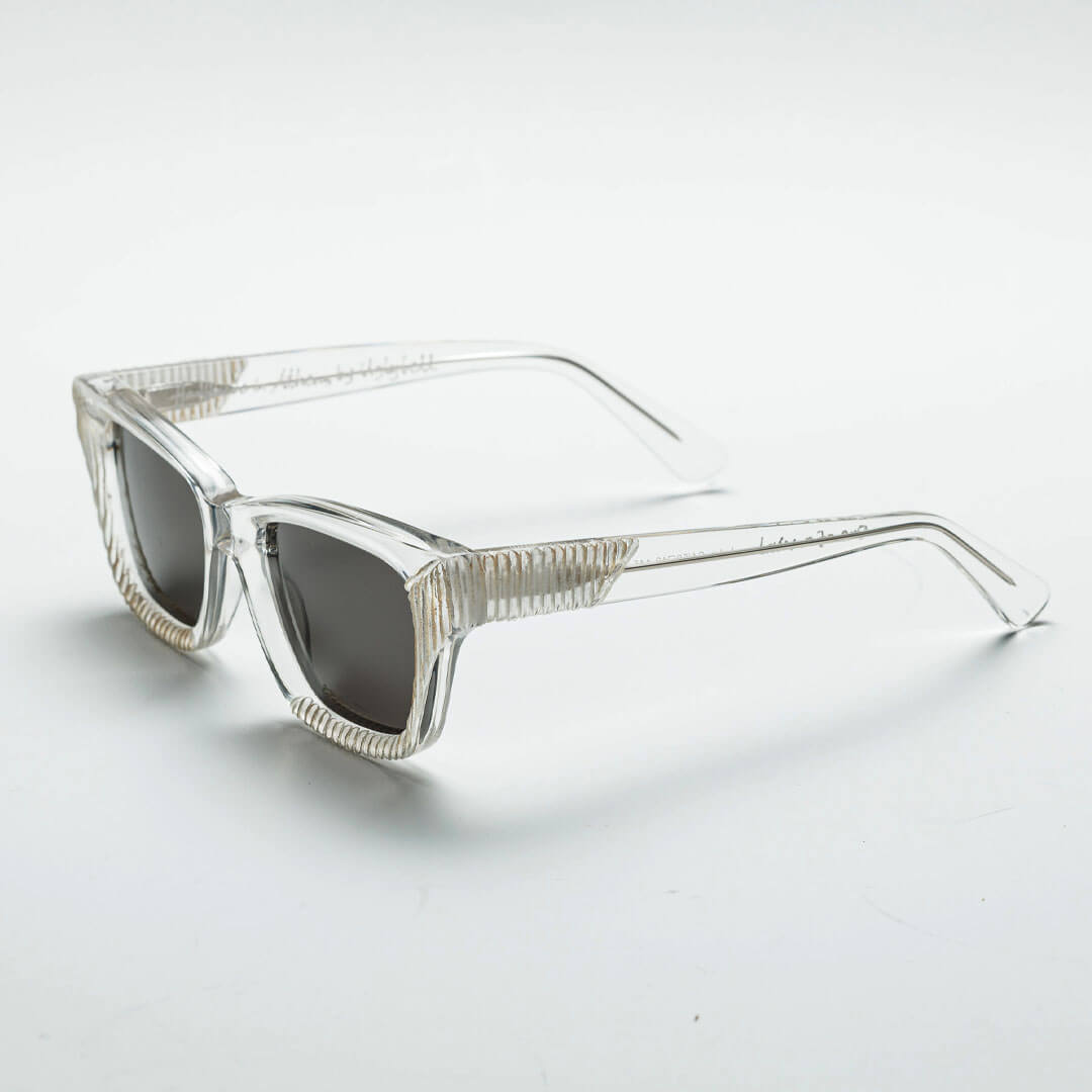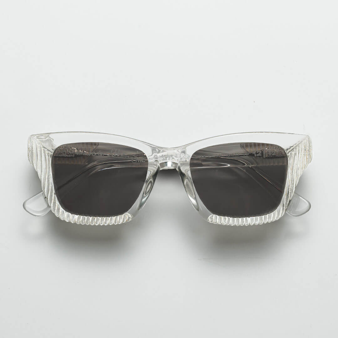 Monture transparente travaillée avec des reliefs texturés, offrant un effet sculptural raffiné. Forme légèrement cat-eye qui ajoute élégance et féminité.