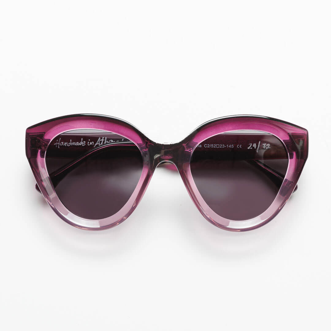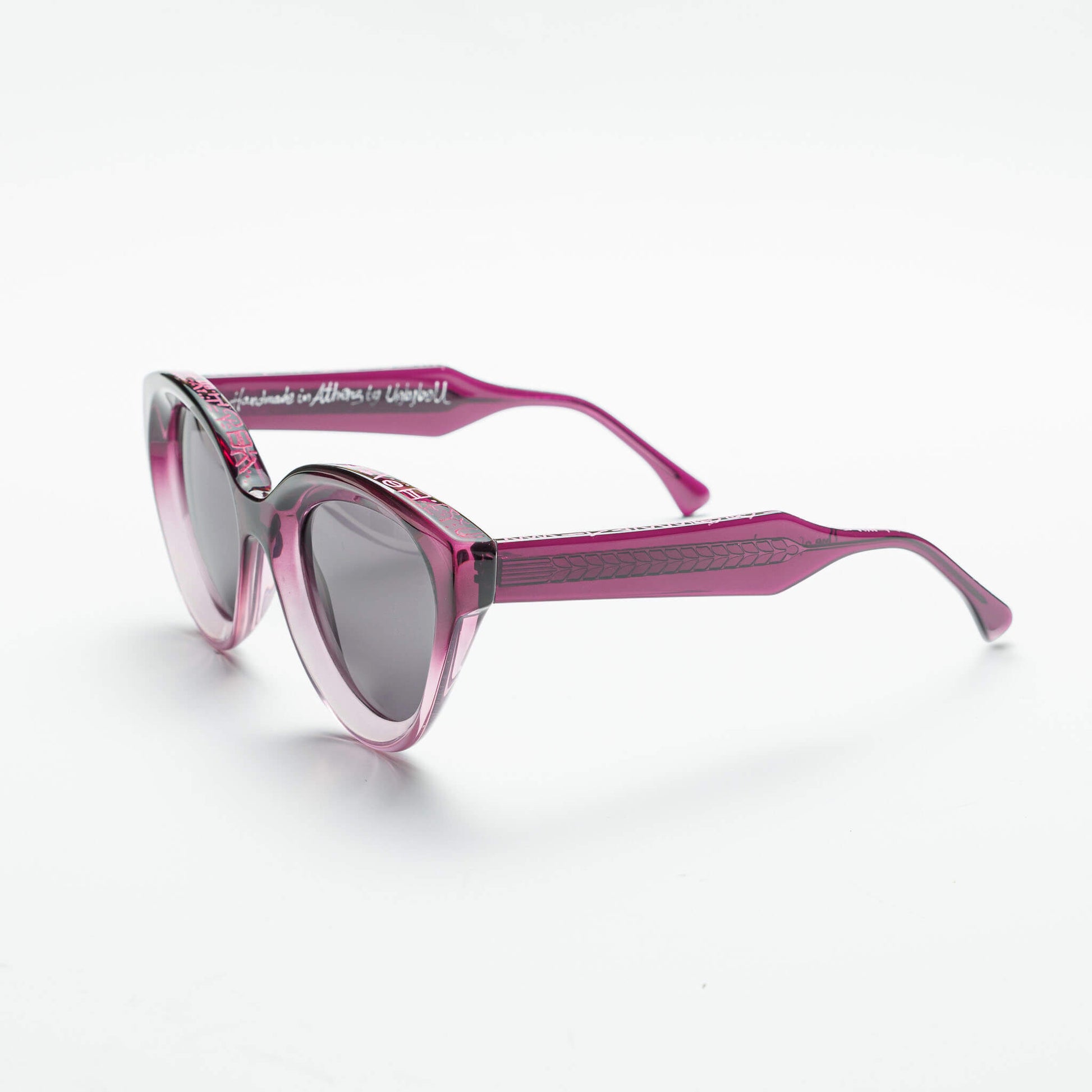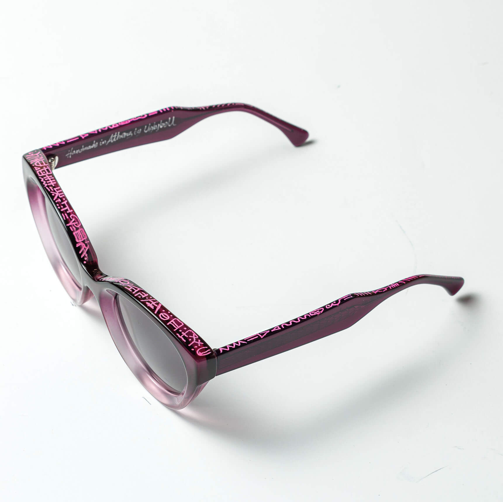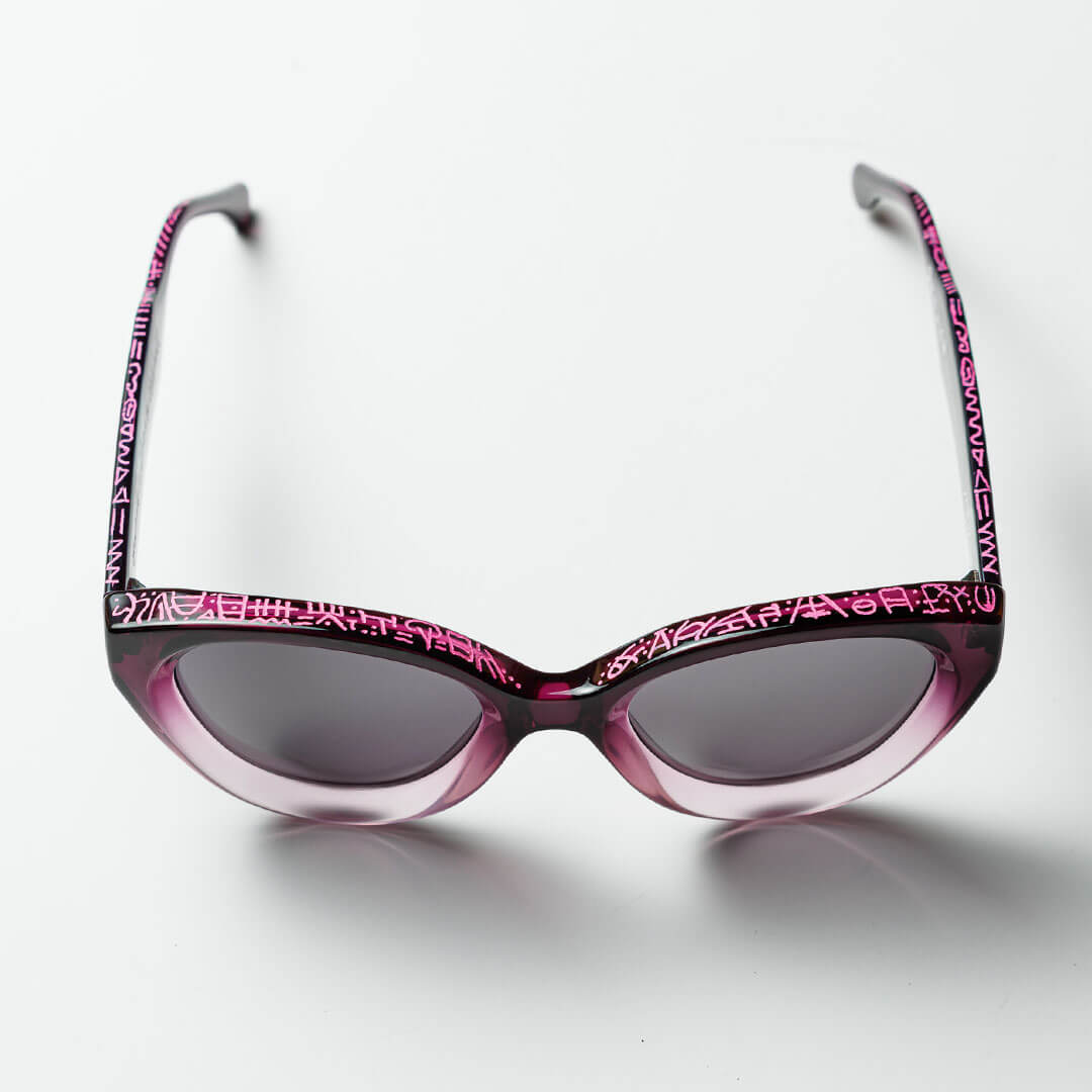 Monture : épaisse en acétate transparent, dégradé du violet foncé vers un rose clair, offrant un effet lumineux et élégant