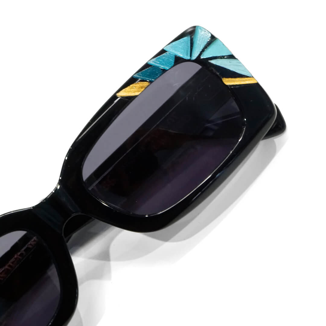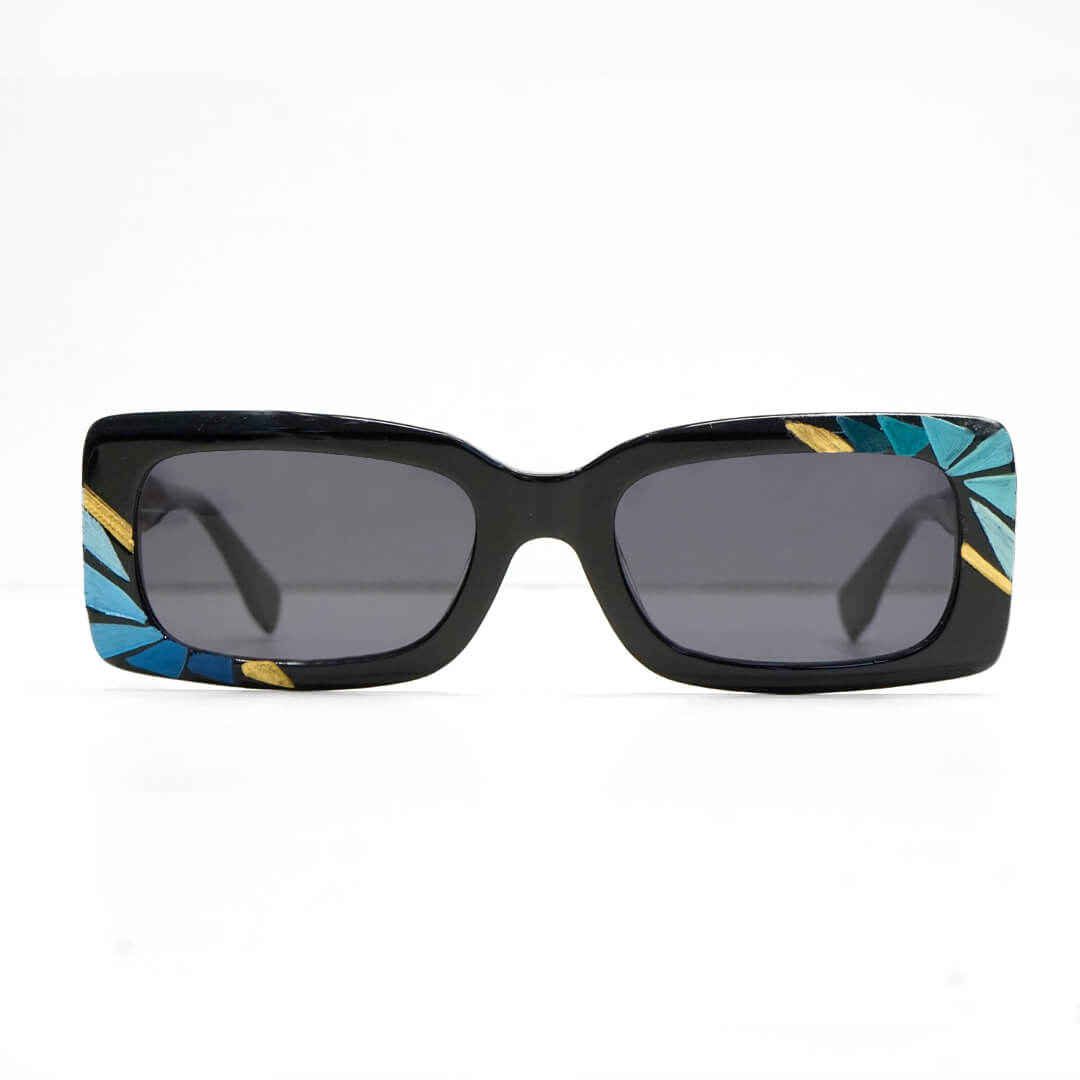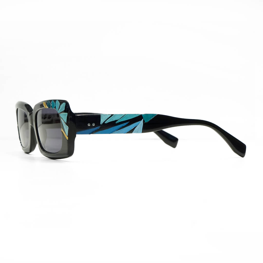 Monture rectangulaire noire au look moderne et affirmé, sublimée par des motifs peints à la main en nuances de bleu et turquoise, avec de fines touches dorées pour un effet artistique et sophistiqué.