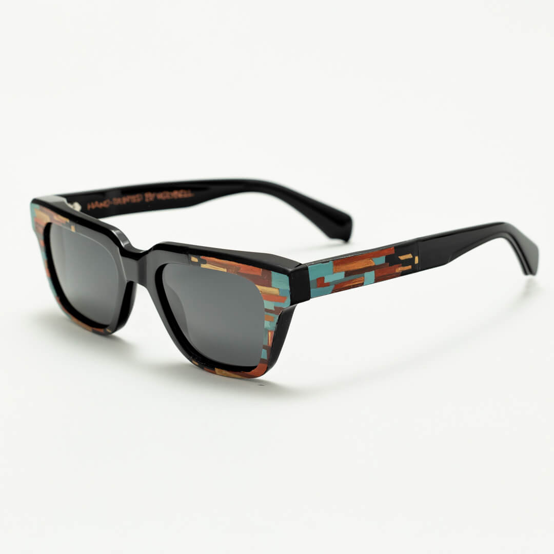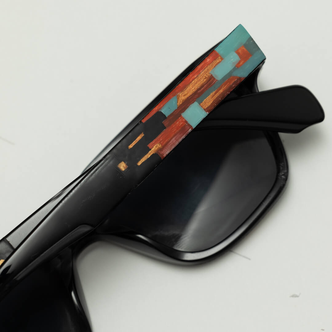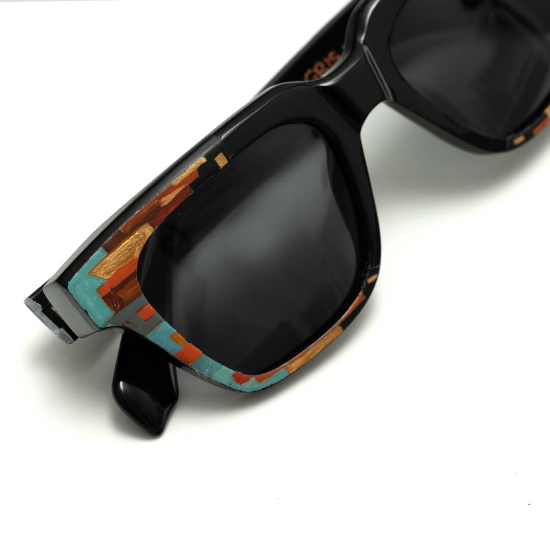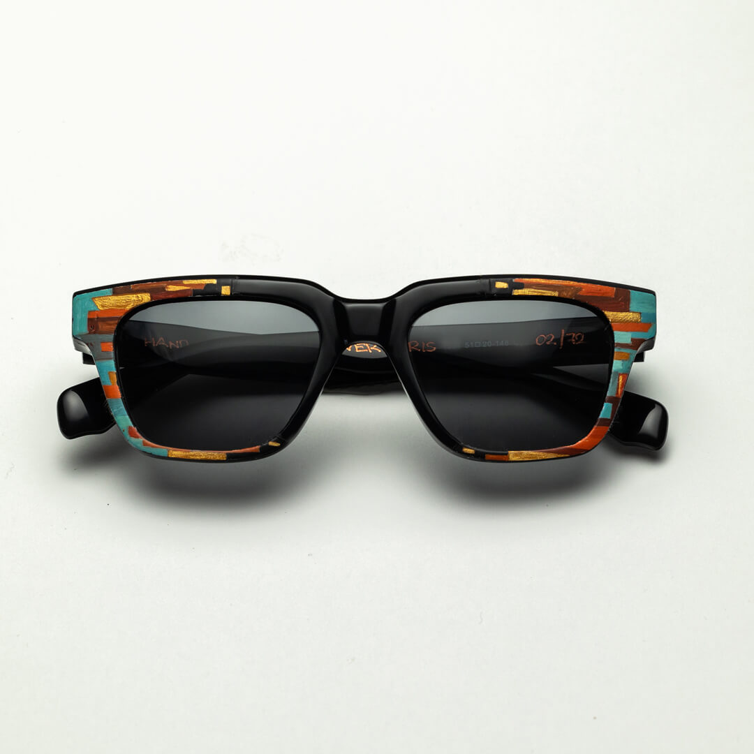 Monture noire épaisse et brillante, mise en valeur par des finitions peintes à la main. Les détails géométriques en turquoise, orange brûlé et doré apportent une touche artistique et originale.